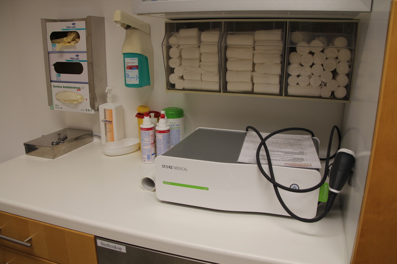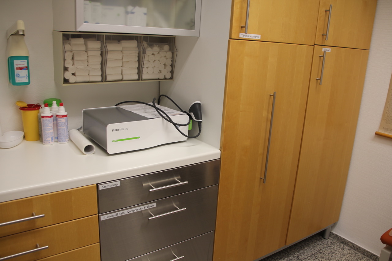 Die ca. 180 qm grosse Praxiseinheit verfügt über 6 Behandlungsräume, eine Röntgeneinheit für digitales Röntgen, sowie Funktionsräume für Sonographie, Stoßwellentherapie, einen Gips-Raum und einen Eingriffsraum zur Versorgung von frischen Verletzungen.